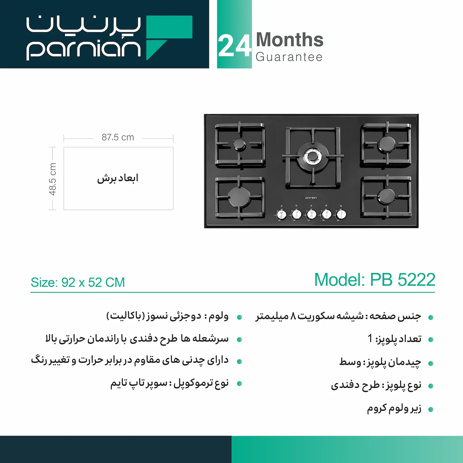 مدل PB 5222 از سری اجاق گازهای صفحه‌ای پرنیان محسوب می‌شود.